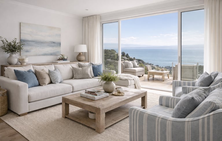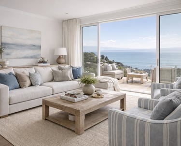 Designed to capture light, openness, and coastal ease, The Seacliff Residence blends soft neutrals with layered textures to create a refined yet relaxed living environment. Framed by expansive views of the water and surrounding hillside homes, the interior emphasizes comfort, balance, and livability—where every element feels intentional and quietly elevated.